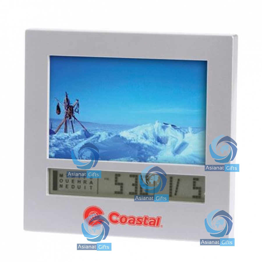 Prominently display your favorite 2" x 3" photo along with a built-in digital calendar and alarm clock. The easy-to-read LCD displays time (12/24-hour), day and date with audible alarm. Matte silver finish frame with easel back fits any decor. Operates on one CR2025 button cell battery, included. Gift boxed.