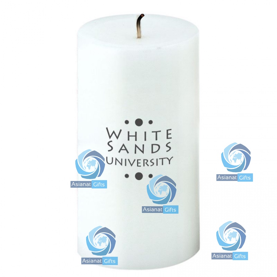 Classy unscented, white pillar candle with your brand message or logo directly on the candle! Great idea for resorts, spas, salons, and more.