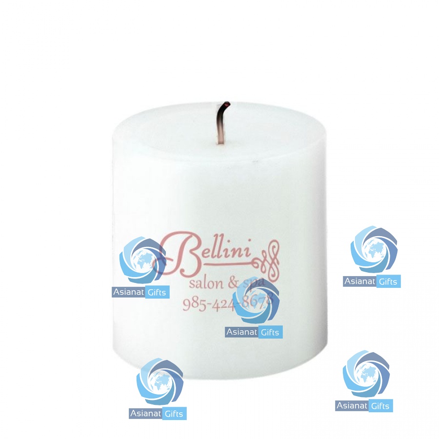 Classy unscented, white pillar candle with your brand message or logo directly on the candle! Great idea for resorts, spas, salons, and more.