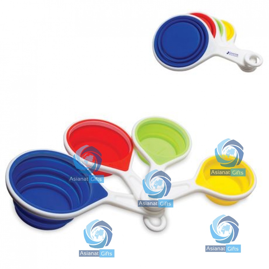 Measuring cups store flat and easily. Four piece set consists of 1/4, 1/2, 3/4 and 1 cup sizes with white handles and multi-color interiors.