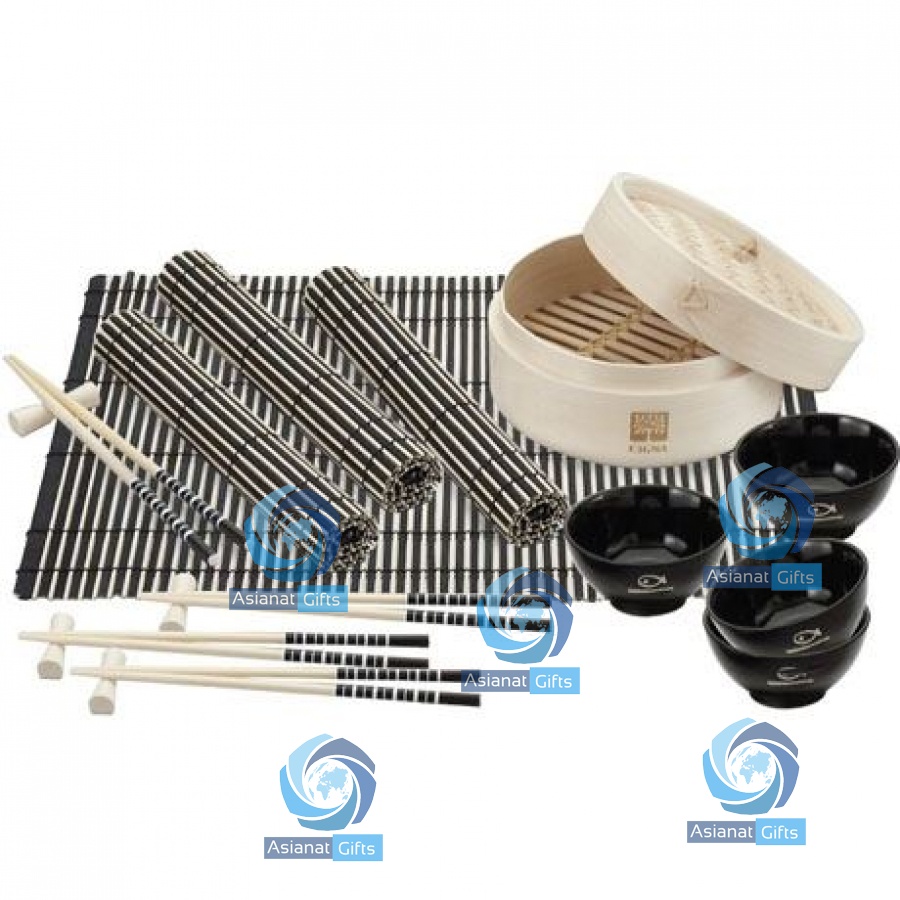 This tastefully exotic four-person dining set includes a bamboo steamer, chop sticks, rests, place mats, and ceramic bowls. Each set is made with FDA compliant materials and comes individually boxed.