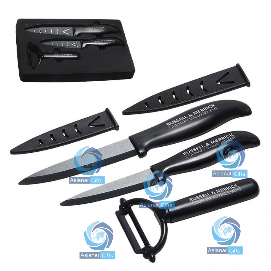 The Black Top Choice Ceramic Knife & Peeler Set is finely crafted with extremely sharp ceramic gunmetal blades. Three piece set contains the following: a 9-1/2" knife with 4-3/4" ceramic blade and protective sheath, a 8-1/4" knife with 3-7/8" ceramic blade and protective sheath and a 5-3/8" peeler with ceramic cutting blade. This handy set is dishwasher safe and comes packaged in a gift box that includes care instructions.