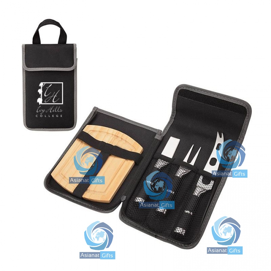 Portable cheese set features stainless steel tools with rubberized comfort grips including: a perforated knife for semi-soft cheeses, a hard cheese knife/spreader and a cheese fork. Also comes with a cutting board. Two-tone 600 denier zippered carry case has hook and loop flap, mesh utensil pockets and a carry handle.