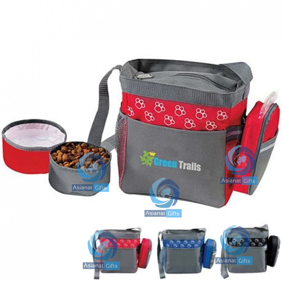 A pet owner's dream, this bag is made out of 600D polyester and includes 2 collapsible bowls for food and water. There is a front pocket with hook and loop closure, and a side mesh pocket. Also included is a detachable zippered case for storing treats and waste bags.