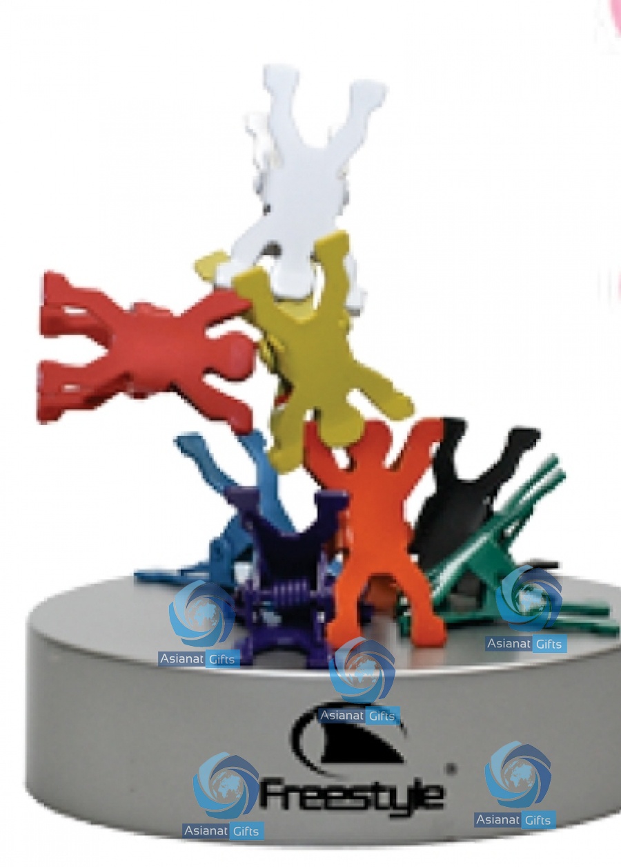 Multi colored people shaped clips on a silver magnetic base. Great for team building. Not for children under 14. 2.75" W x 0.95" H x 3.5" L