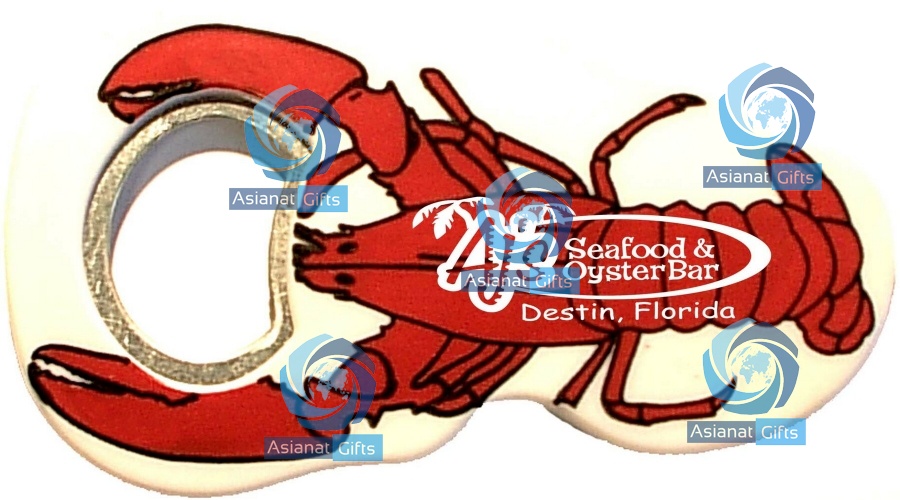 Jumbo size lobster shape magnetic bottle opener. Big imprint area for logo. Strong refrigerator magnet.Solid metal construction for the opener.Affordable and long-lasting. Every household loves it! Ideal for beverage, bottle, animal, sea food, restaurant and self promos.Custom shape welcome. 3 5/8" L x 2 3/32" W