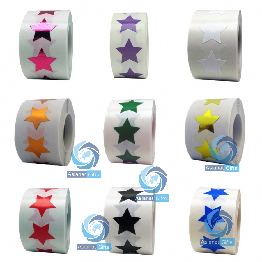 Star stickers measure at 3/4 inch from highest point to lowest point. 500 labels come on a roll. Perfect for all occasions. Teachers use these to stick to student worksheets, charts or even pass out as awards to place on t shirts.