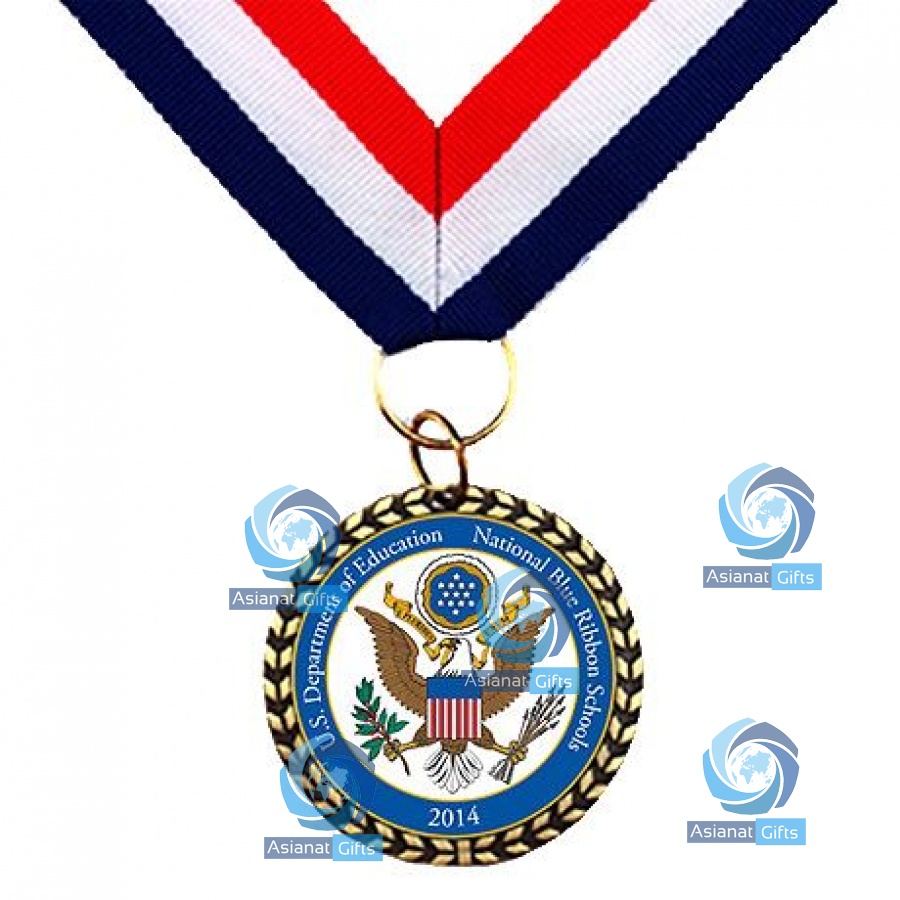 Die cast medal features a unique wreath border on both sides and includes your choice of antique metal finish. Also includes a 7/8" wide red/white/blue neck ribbon.