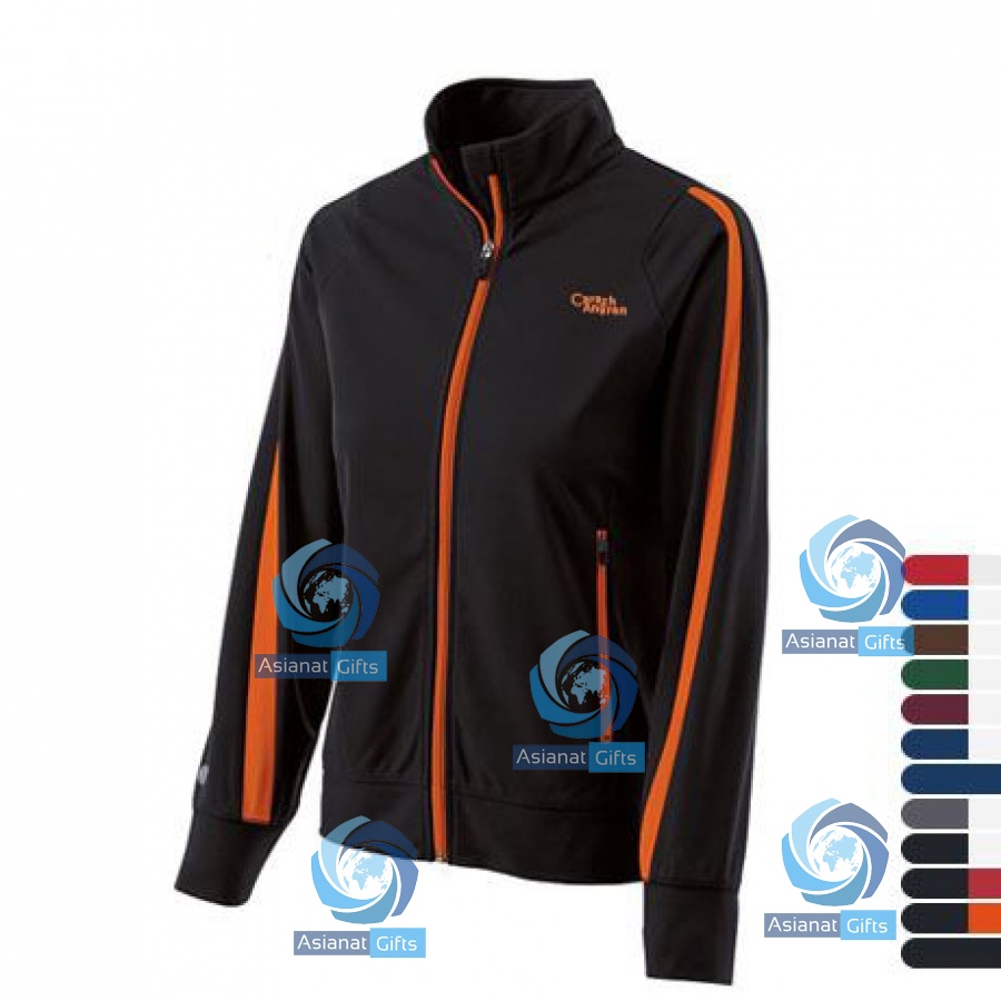 This jacket is a 100% polyester brushed tricot with a peached finish. Dual inside pockets, front zippered pockets.