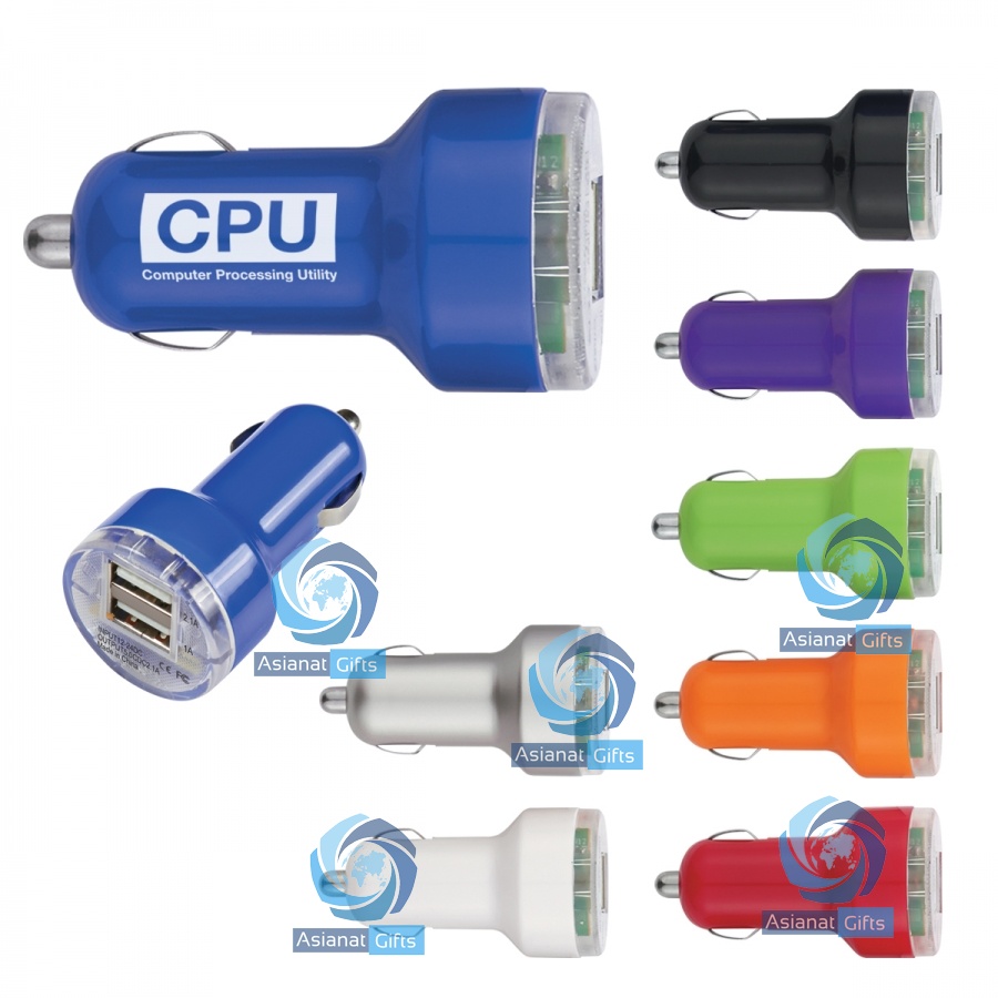 Compatible with most standard cigarette lighter ports. Dual 5 volt USB ports (1 AMP & 2.1 AMP output). Charge multiple devices on the go. Overload and short circuit protection. Cords not included. 2 1/4" W x 3/4" H