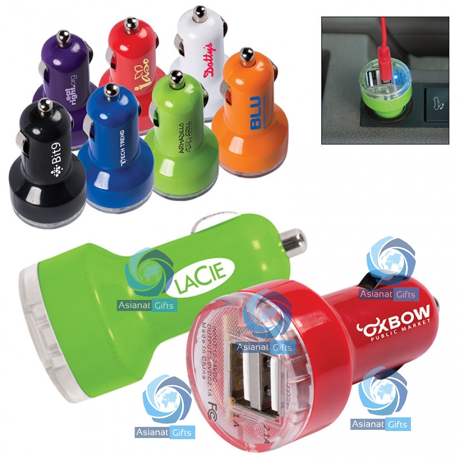This universal duo USB car adapter allows you to charge up to 2 portable devices at once, right from the car, on the go. Remove cigarette lighter from dashboard and replace with adapter. USB cable not included. Made of ABS Plastic device with metal components. Also features blue LED indicator light, which is illuminated at all times device is plugged into cigarette lighter. Charge time varies by device. 2.5" W x 1.25" Diameter