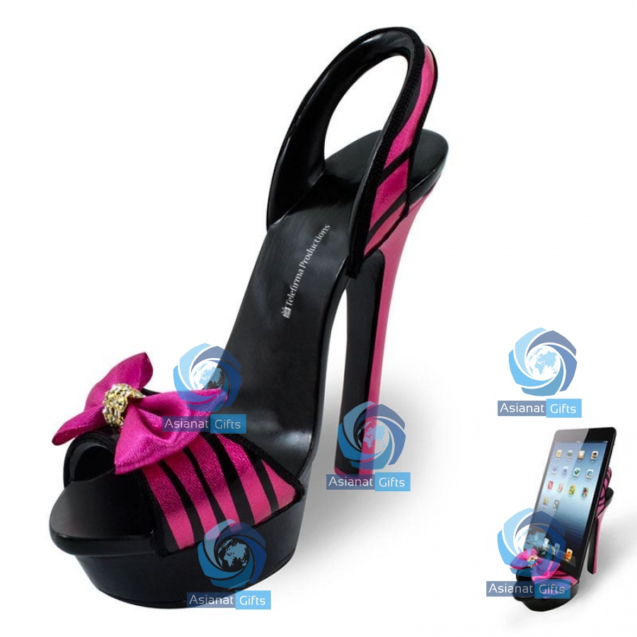 Fun and unique stand is ideal for holding tablets, mobile phones or business cards. Stand is shaped like a pink zebra sandal stiletto.