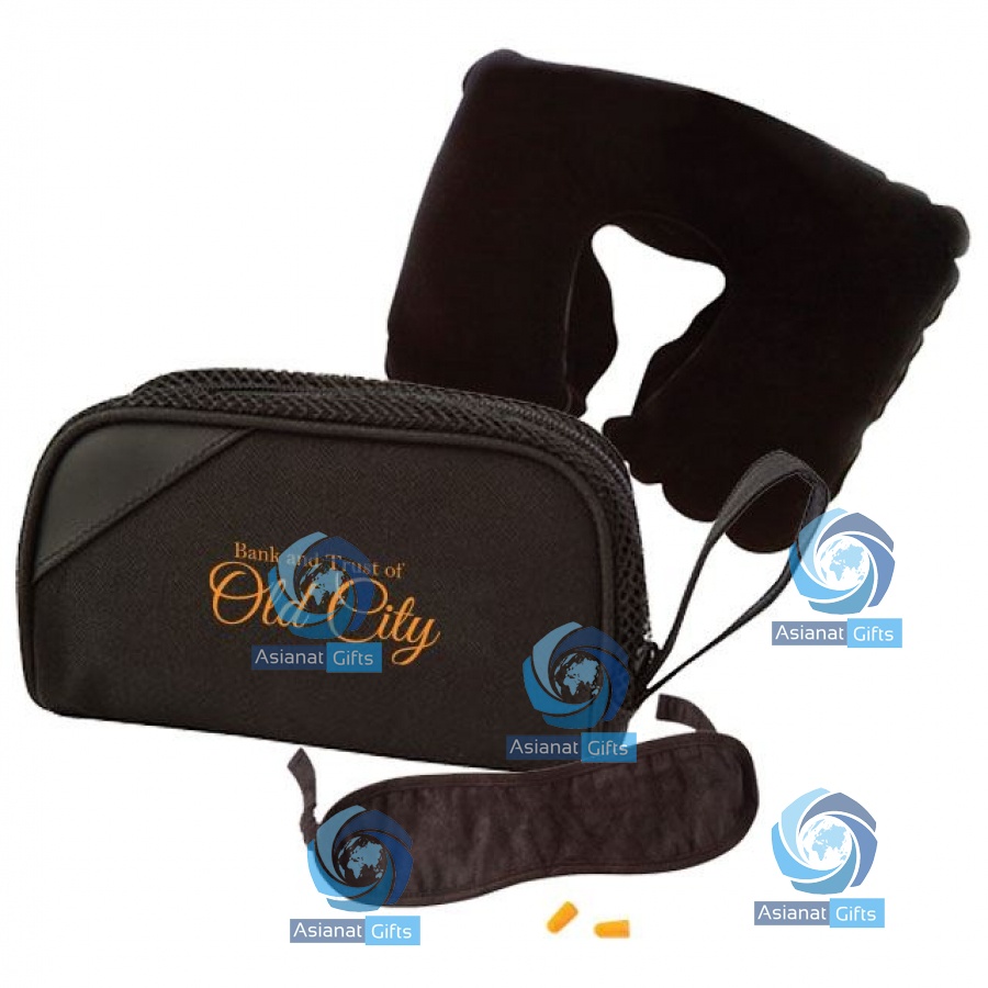 Durable nylon multi-purpose bag features netted accent trim, soft faux leather corner tab, black zipper closure, and fixed wrist handle. Kit includes an inflatable neck pillow, ultra soft terry suede sleep mask, and ear plugs.
