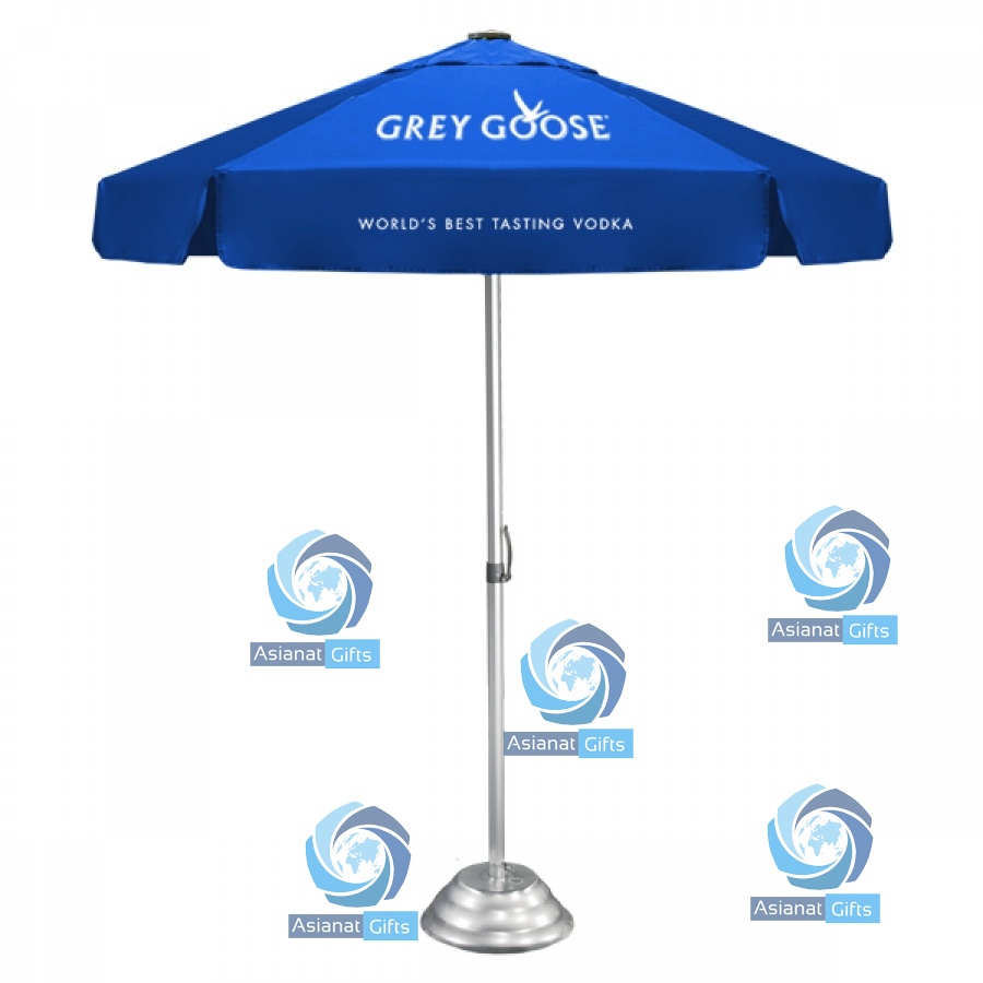 Commercial grade patio umbrella. 7 foot (84") vented canopy arc - 6 sections - Fabric: High-density coated 8oz polyester - Extra heavy fiberglass ribs - Safety opening device (Runner) - Aircraft aluminum 38mm. O.D. 8 sided pole - Silver or white fillable bases sold separately.