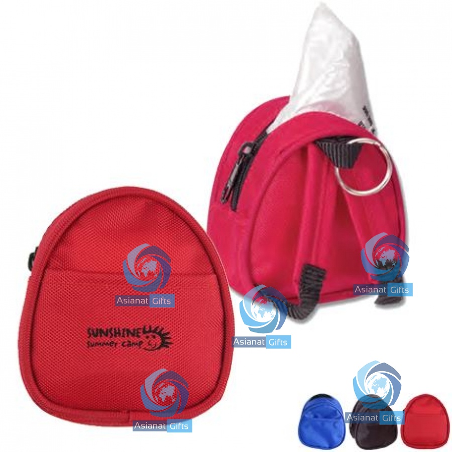 Never get caught in the rain empty-handed again! Unique mini backpack with front pocket, key ring and back straps to attach to a belt or purse holds a rain poncho. Reusable as a keychain purse. 420 Denier Nylon.